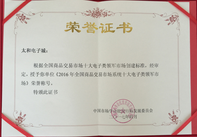 永利304官网唯一电子城荣获 2016年天下商品生意市场系统十大电子类领军市场